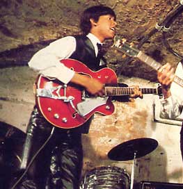 Stig O'Hara, the Rutles' lead guitarist, pictured below in an early Cavern Club performance in Rutland in 1962, had hidden in the background so much that a rumour went around in 1969 that he was dead. According to the rumor, he was supposed to have been killed in a flash fire at a water bed shop and replaced by a plastic and wax replica from Madame Tussauds.